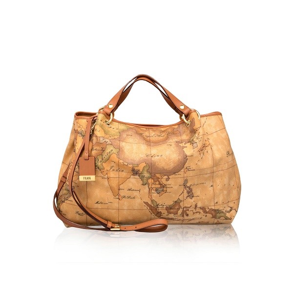 Borsa in tessuto stampato con cartina geografica e finiture in pelle vacchetta color cuoio.